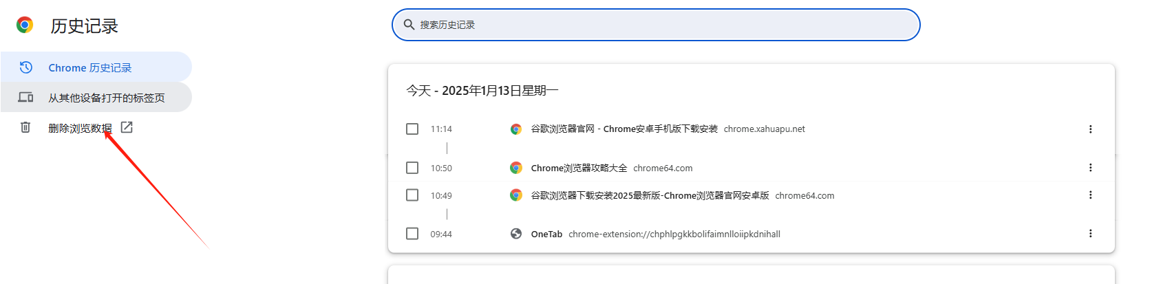 5.如果您想清除这些历史记录,请点击页面右侧的“清除浏览数据...”按钮。这将打开一个新窗口,您可以在其中选择要清除的数据类型(浏览历史、下载历史、Cookie等)以及时间范围。